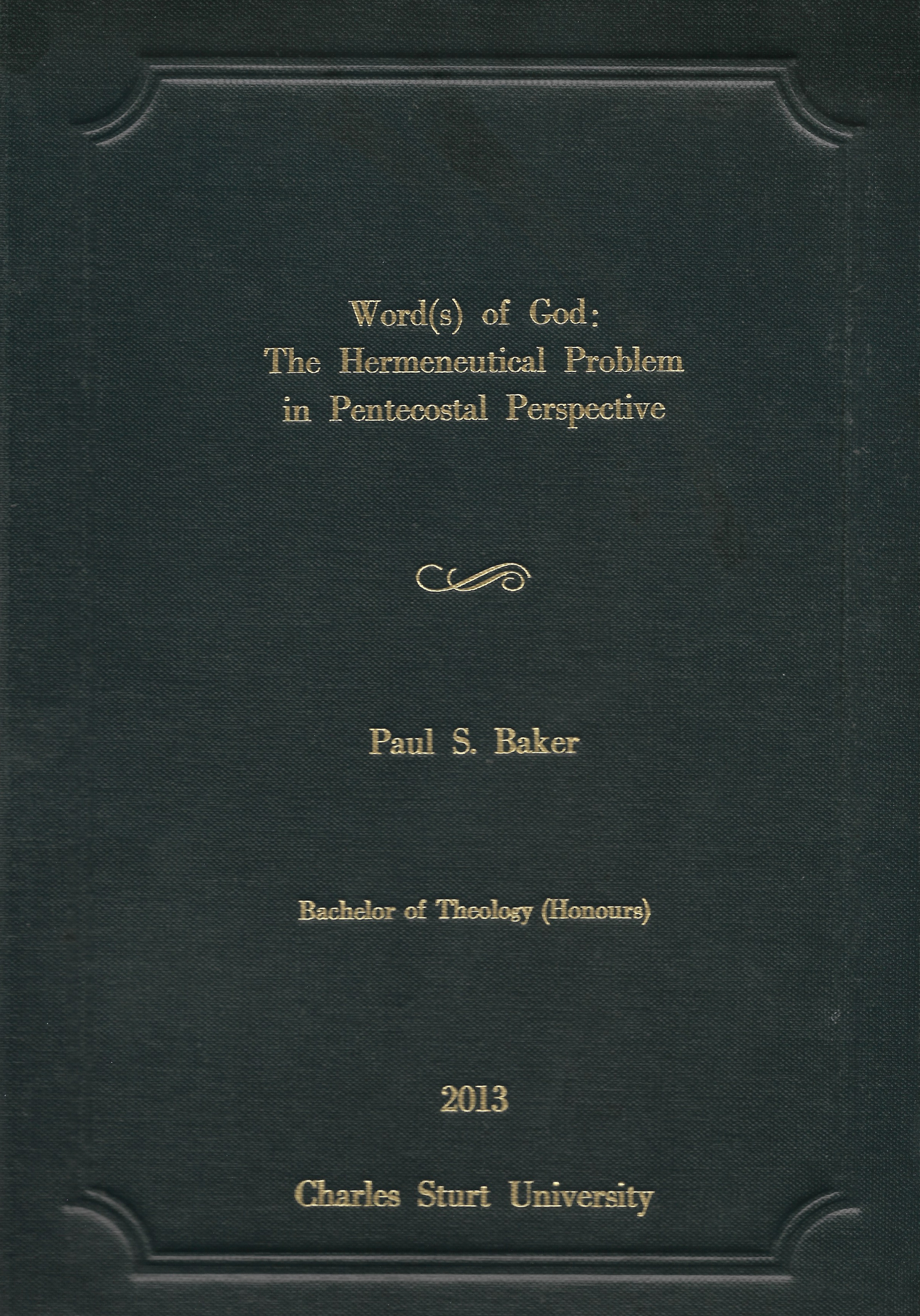 “Word(s) of God: The Hermeneutical Problem in Pentecostal Perspective.” Honours diss., Charles Sturt University, 2013.